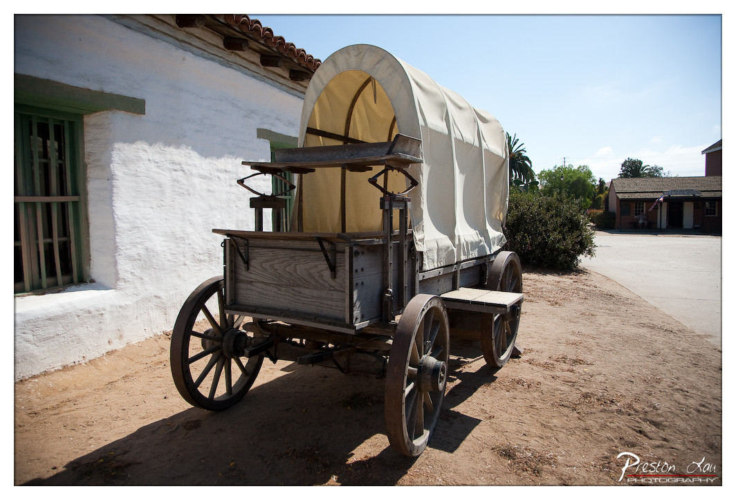 This photograph captures the quiet dignity of a historic covered wagon, evoking a sense of pioneer life and timelessness. The composition grounds the wagon in its setting, with the white adobe wall and dusty earth reinforcing the authenticity of the scene. While the lighting is strong and clear, it slightly flattens the emotional depth, and the distant background introduces a subtle modern intrusion. Still, the image succeeds in conveying a narrative of history and endurance.