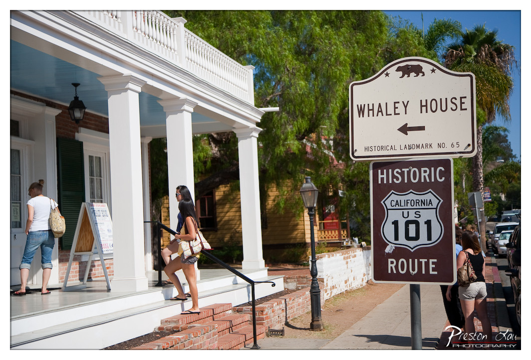 This photograph captures a vibrant slice of California’s historic charm, blending architectural heritage with the casual energy of modern tourism. The Whaley House and Route 101 signage anchor the scene in place and time, while the figures moving through the frame lend a sense of life and continuity. The bright daylight enhances the colors and details, though the composition feels slightly cluttered, pulling focus from the primary subject.