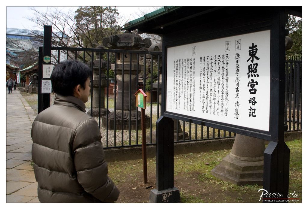 This photograph captures a quiet moment of contemplation at a traditional Japanese shrine, where a visitor pauses to read an informational sign. The composition balances cultural context with human presence, grounding the scene in both place and narrative. While the image conveys a sense of stillness and respect, its potential is slightly diminished by a lack of visual dynamism and a muted atmosphere that feels more documentary than evocative.
