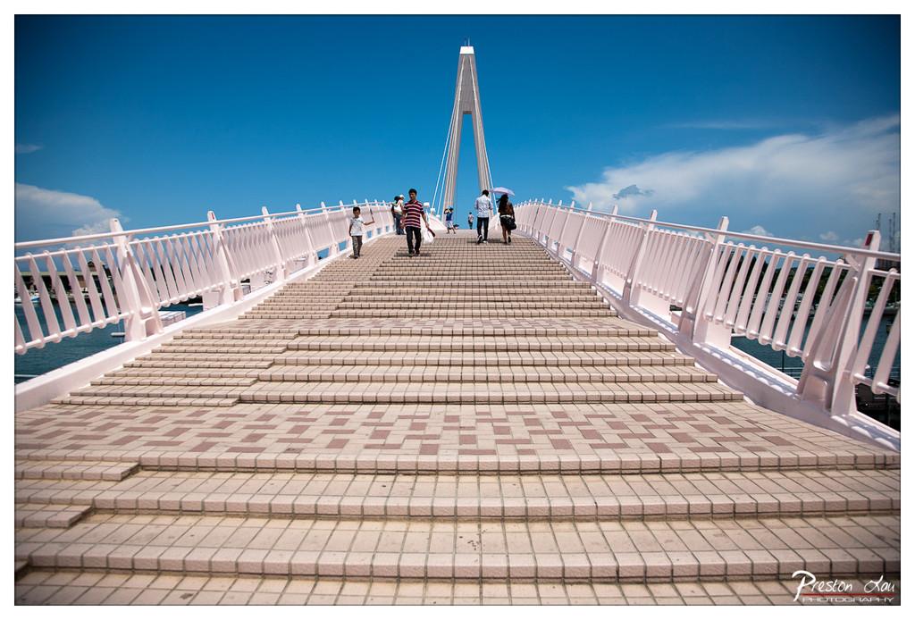 This photograph captures a striking sense of journey and scale, drawing the viewer’s eye up a long, tiled staircase toward a modern cable-stayed bridge under a vast blue sky. The bright, sunlit scene evokes a feeling of openness and movement, with the white railings and clean lines enhancing the architectural beauty. While the image is visually compelling, the slightly overexposed sky and the scattered composition of people dilute the overall focus, preventing it from achieving a more powerful and cohesive narrative.