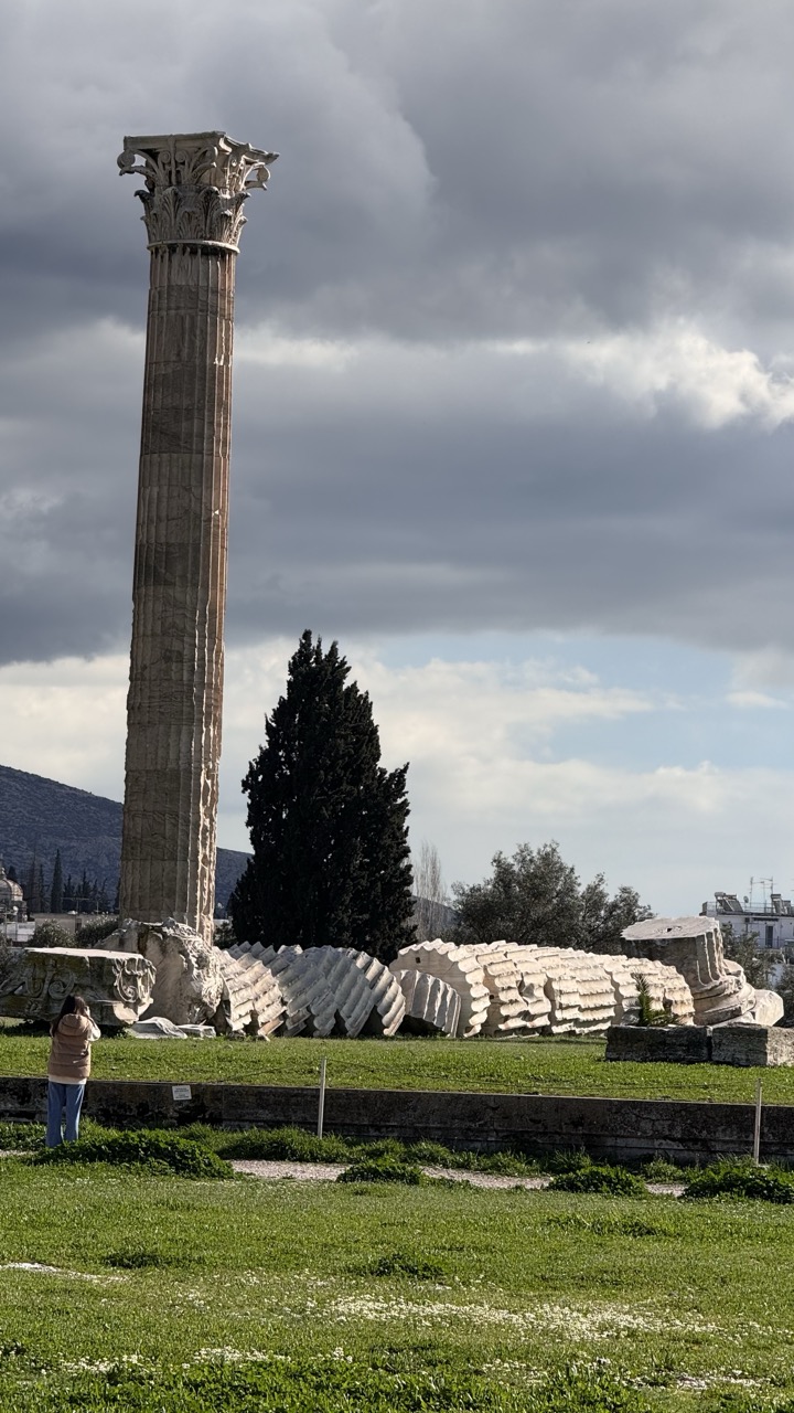 The temple columns are placed along the left third of the frame, creating a balanced asymmetry that draws the eye toward the expansive sky. The horizon line is well-positioned, and the inclusion of the figure adds depth and narrative, guiding the viewer’s journey through the scene.