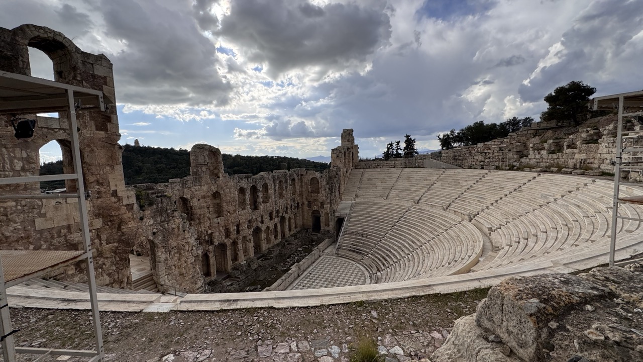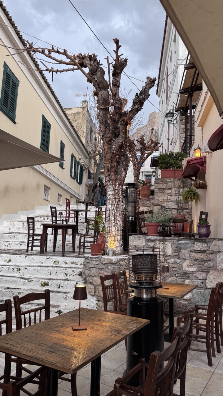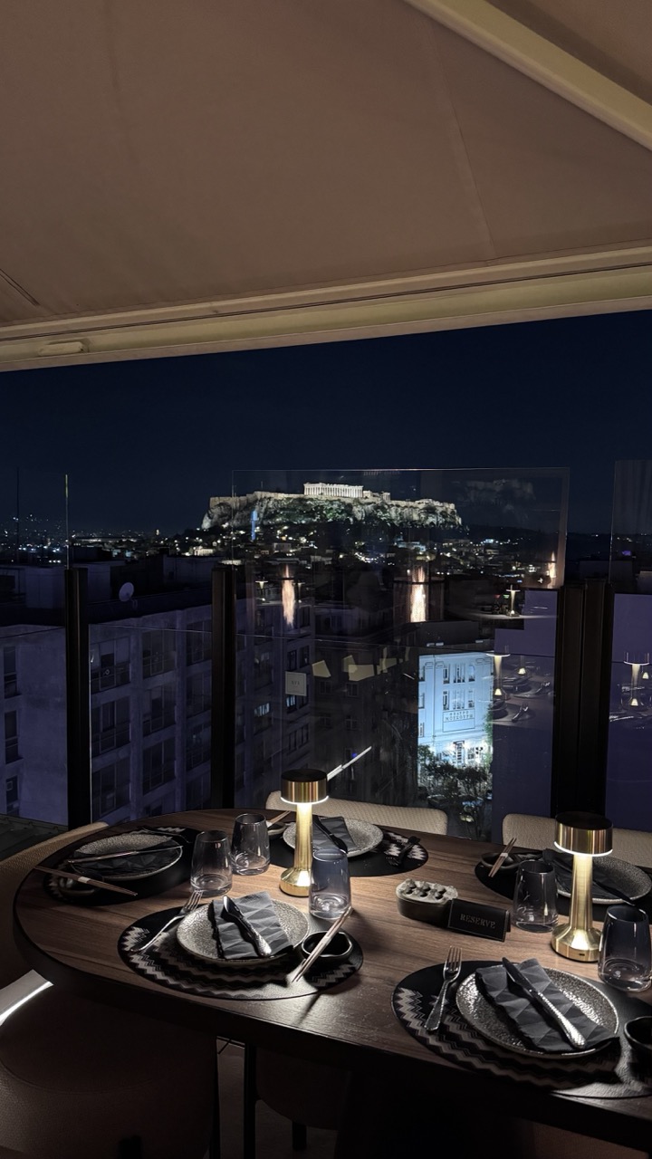 The table is positioned to lead the viewer’s gaze toward the Acropolis, creating a strong visual axis. The balance between the foreground dining setup and the expansive city view is well-handled, with the glass barrier adding depth without disrupting the composition.