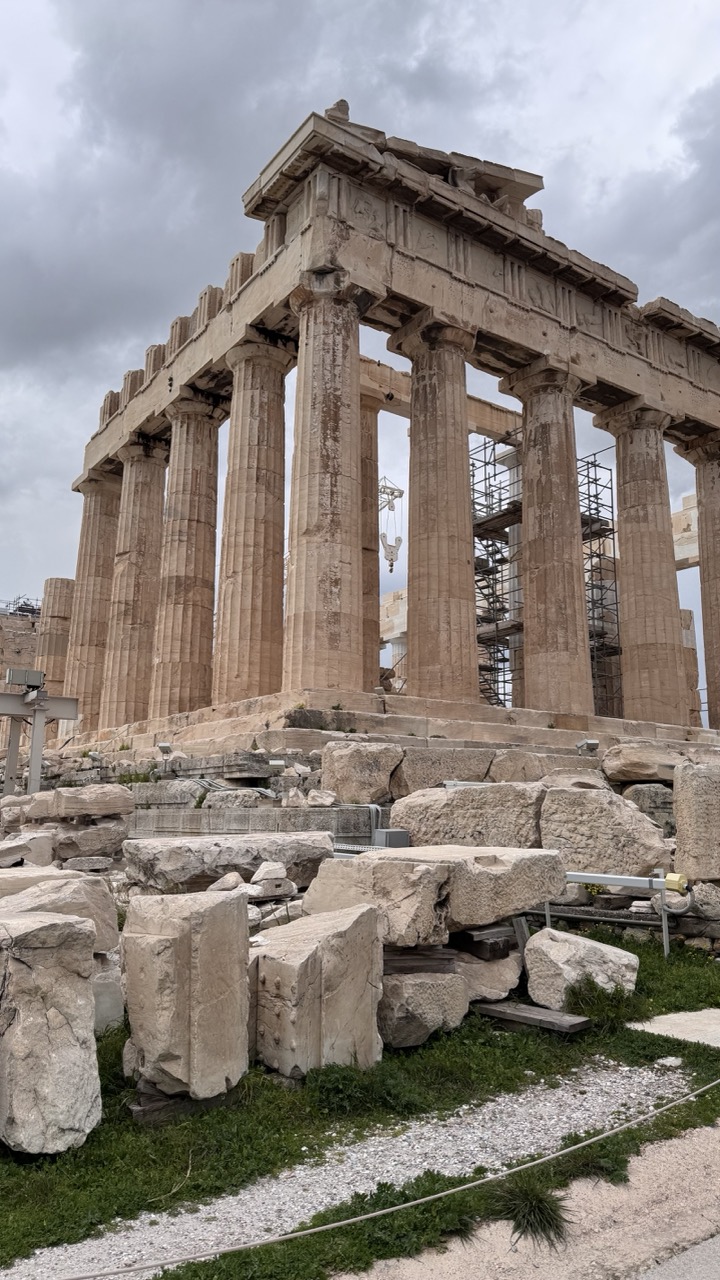 The low-angle perspective emphasizes the towering scale of the columns, while the diagonal alignment of the structure leads the eye naturally across the frame. The scattered ruins in the foreground add depth and context, grounding the viewer in the site’s archaeological reality.