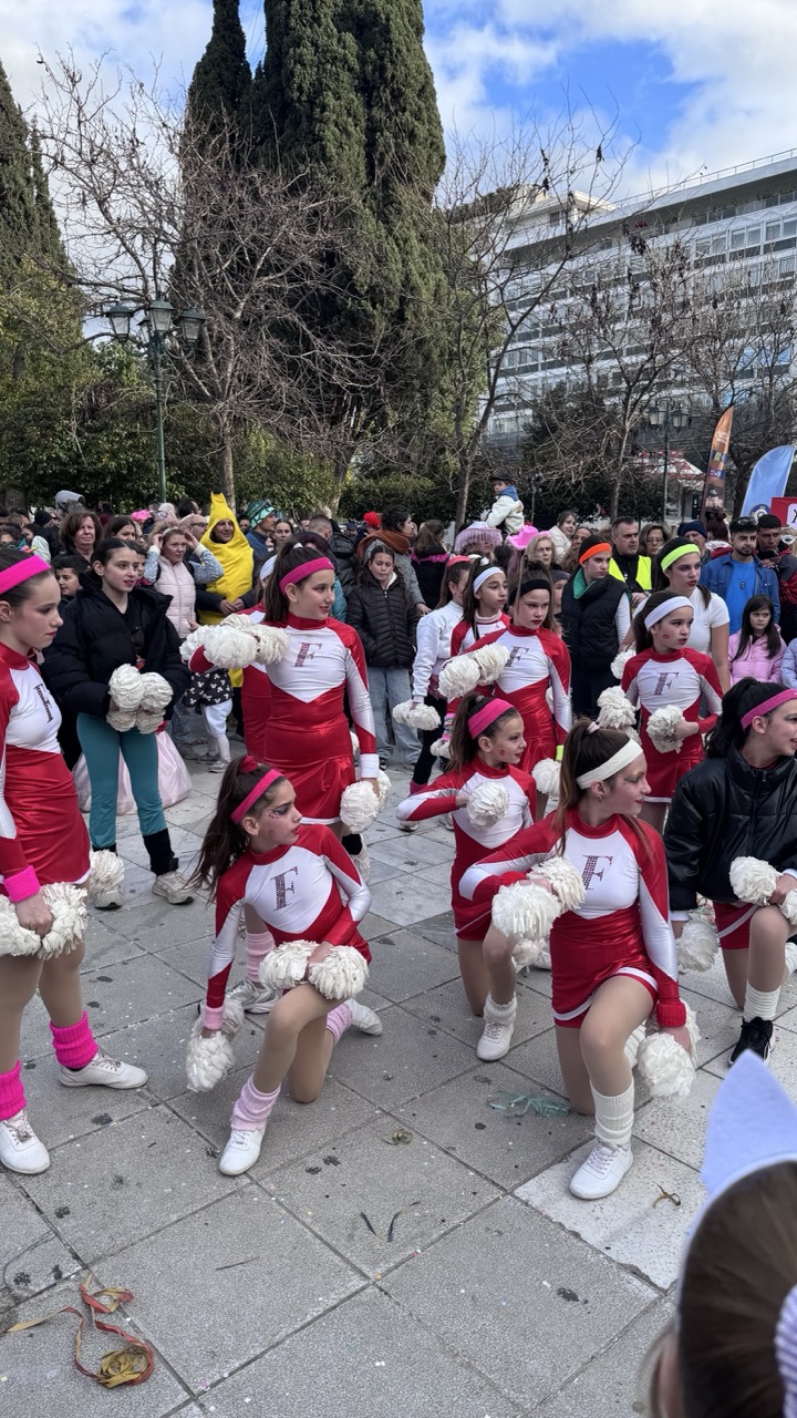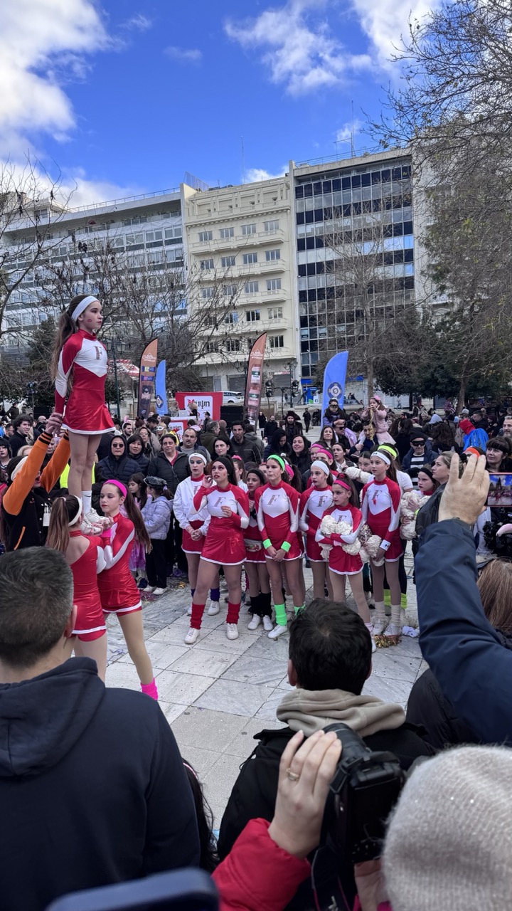 This photograph captures the vibrant energy of a youth cheerleading performance in a public square, where youthful enthusiasm and community engagement converge. The dancers’ synchronized poses and bright uniforms inject a sense of motion and joy, while the surrounding crowd adds layers of authenticity and occasion. Though the image is slightly cluttered and the lighting is flat, the scene’s inherent dynamism and cultural context elevate it beyond a mere snapshot into a lively record of communal celebration.