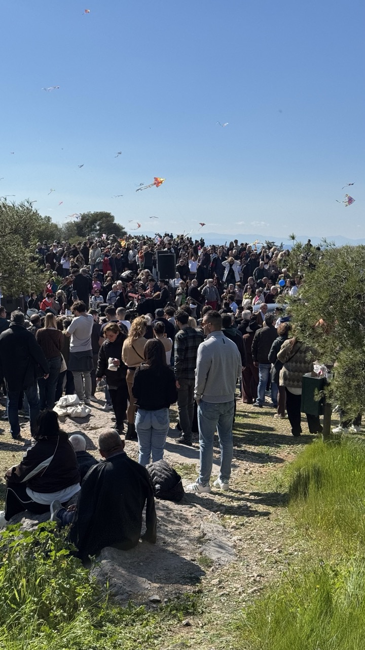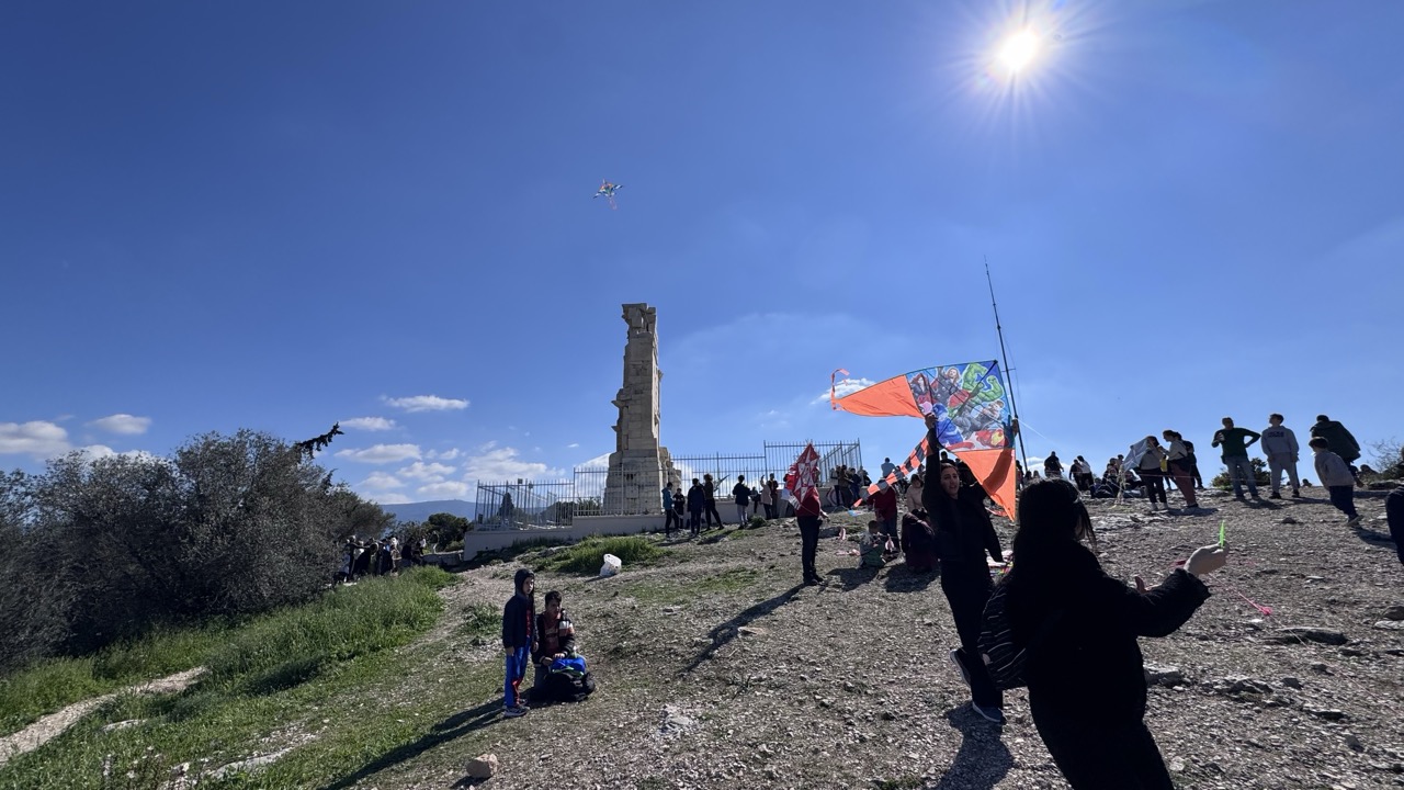 This photograph captures a vibrant, sun-drenched moment of communal joy set against the timeless backdrop of ancient ruins, where modern life and history intersect in striking harmony. The bright blue sky and the dynamic presence of kites and people infuse the scene with energy and movement, while the weathered column anchors the image in a sense of historical depth. While the composition is slightly unbalanced and the lighting harsh, the image succeeds in conveying a moment of spontaneous celebration that feels both authentic and poetic.