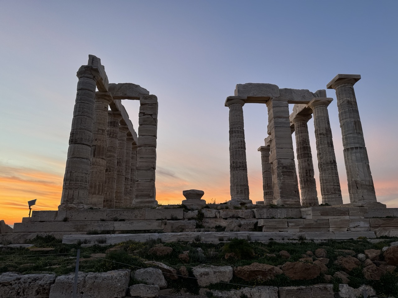 This photograph captures the timeless grandeur of the Temple of Poseidon at Cape Sounion, where ancient stone columns rise like sentinels against a soft, pastel sky. The warm glow of dusk bathes the weathered marble in a golden light, emphasizing both the monument’s enduring strength and its poignant decay. While the composition is strong and the moment beautifully captured, the image could benefit from slightly deeper contrast to enhance the texture of the stone and the drama of the light.