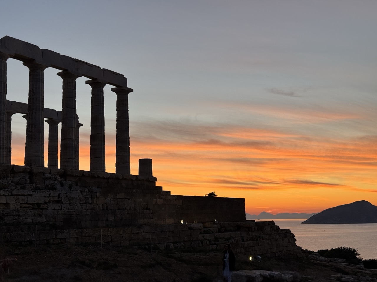 This photograph captures the timeless majesty of ancient ruins at sunset, where the silhouette of the temple columns stands in solemn contrast against a fiery sky. The warm gradient of orange and gold evokes a sense of historical grandeur and quiet reverence, while the lone figure in the foreground grounds the scene in human scale and contemplation. The image is emotionally resonant and compositionally strong, though the underexposed foreground slightly dampens the visual richness of the ruins.