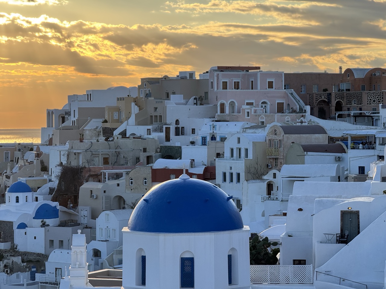 This photograph captures the timeless beauty of a Cycladic village at sunset, where the interplay of light and architecture evokes a sense of serene grandeur. The vibrant blue dome anchors the composition, drawing the eye through the layered white structures toward the golden horizon, where the sun breaks through the clouds in dramatic rays. While the scene is visually rich, the slightly overexposed sky and dense arrangement of buildings create a minor tension between clarity and atmospheric depth.