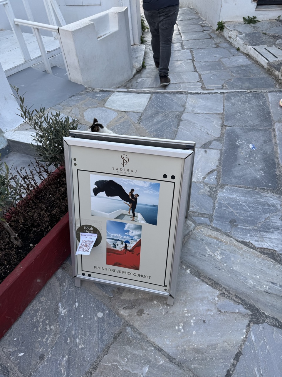 This photograph captures a quiet moment on a sun-dappled Greek alleyway, where the juxtaposition of a promotional sign and a passing figure creates a subtle narrative of tourism and daily life. The composition draws the eye to the sign’s bold imagery of a flying dress photoshoot, which contrasts with the mundane reality of the cobblestone path and casual pedestrian. While the scene feels authentic and grounded, the lack of dynamic lighting and a more intentional framing prevent it from feeling truly compelling—more like a snapshot than a deliberate composition.