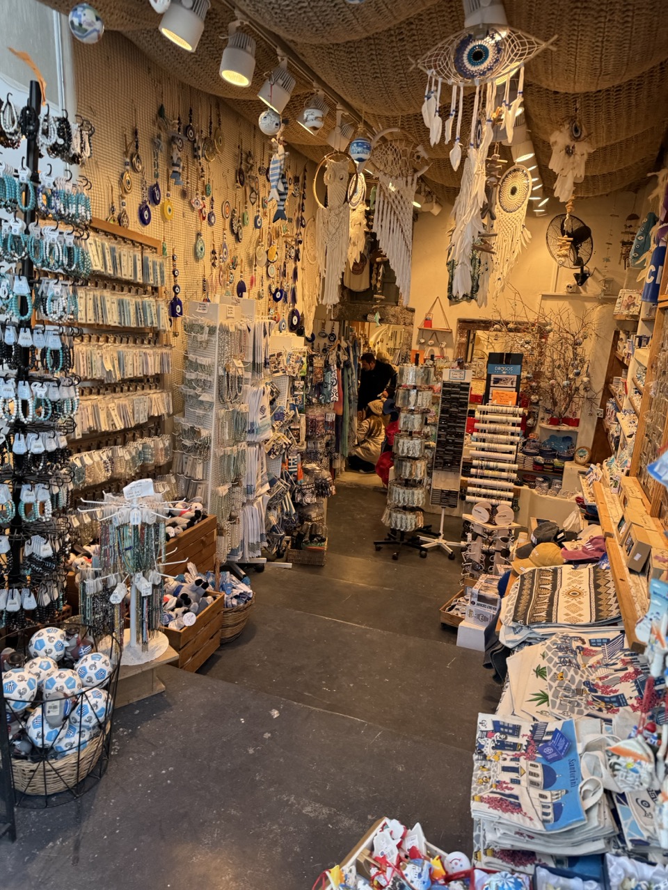 The image tells a story of cultural tradition and commerce, with a strong sense of place. The arrangement of hanging dreamcatchers and evil eyes adds whimsy and authenticity, elevating it beyond a simple snapshot.