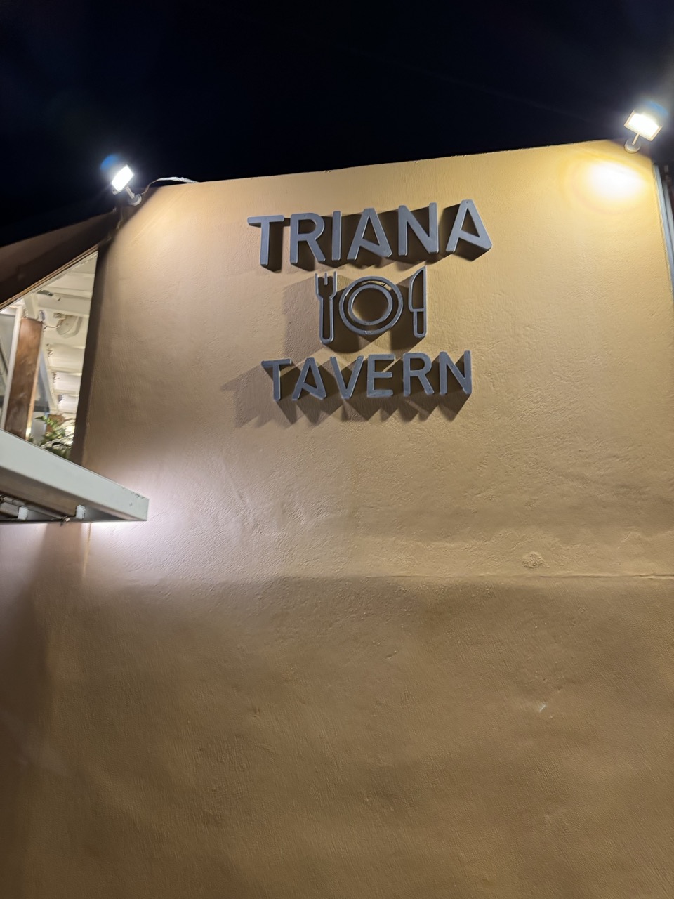 The warm, directional lighting from the spotlights creates a cozy ambiance and highlights the texture of the wall and the three-dimensional sign. The contrast between the lit area and the dark sky adds depth, though the harshness of the lights causes some glare.