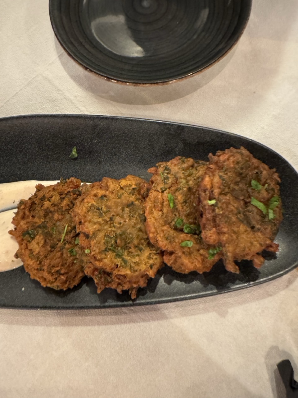 The earthy tones of the fritters contrast nicely with the deep black of the plate and the soft neutral background. The green herbs provide a pop of color, but the overall palette remains subdued, with a muted warmth that feels natural but not particularly vibrant.