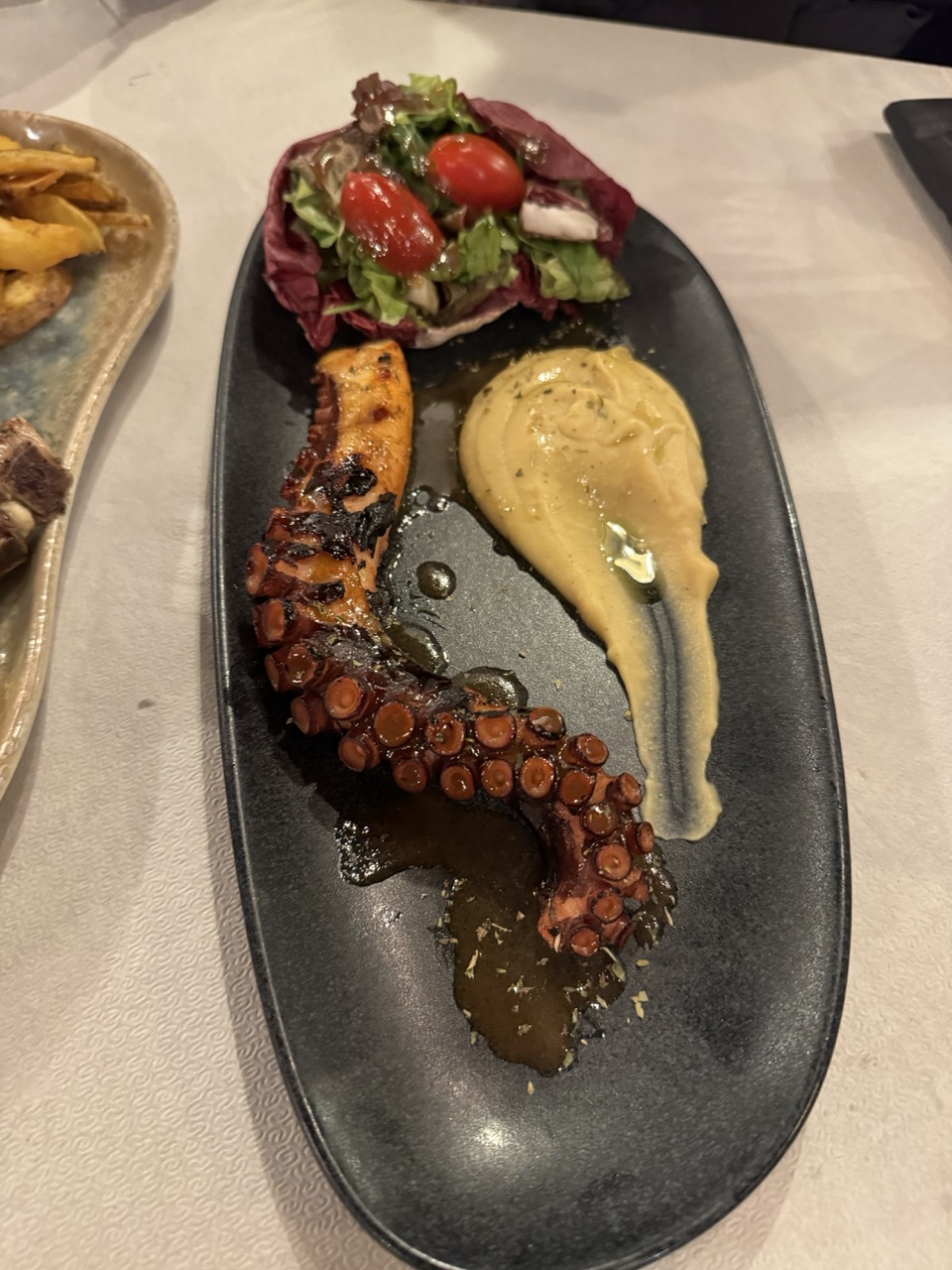 The long oval plate provides a strong horizontal line, but the inclusion of the adjacent plate on the left creates a slight imbalance. The placement of the octopus and salad feels deliberate, yet the image is cropped too tightly on the left, cutting off context and slightly disrupting visual harmony.