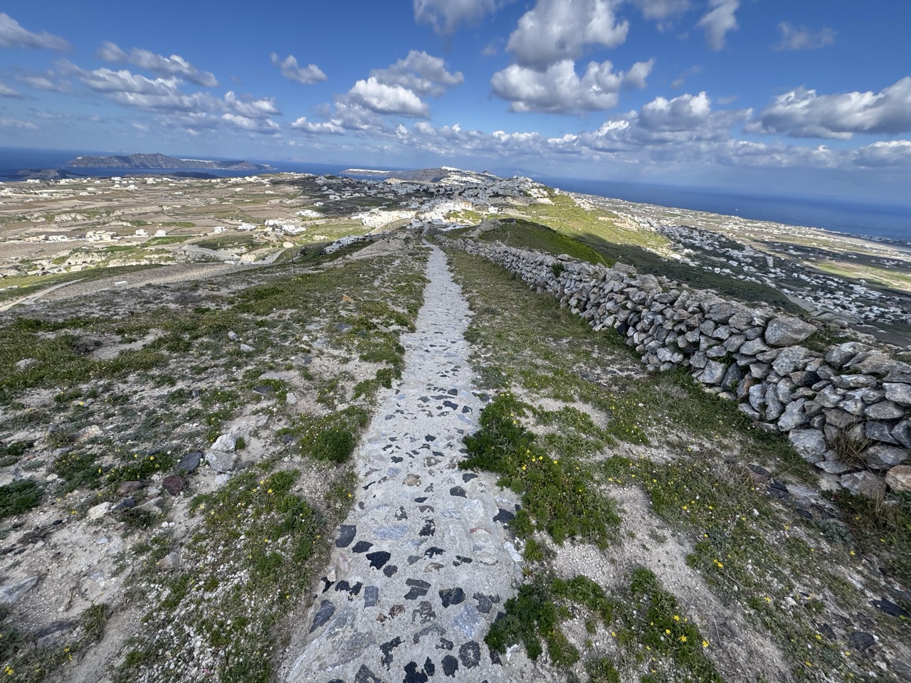 This photograph captures the serene and timeless beauty of a Mediterranean hillside path, leading the eye toward a cluster of whitewashed buildings nestled between the sea and sky. The expansive composition and vivid natural lighting create a sense of openness and tranquility, while the weathered stone path adds a tactile, human element to the landscape. Though the scene is visually rich, the lack of a human presence keeps the mood contemplative rather than deeply personal.