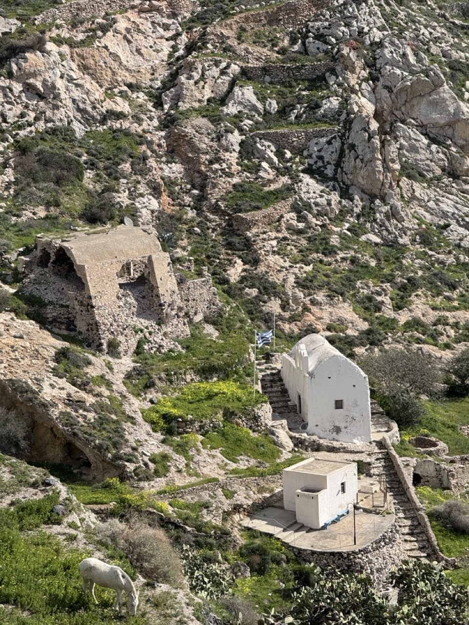 This photograph captures the timeless harmony between human settlement and rugged natural landscape, where ancient stone structures cling to a sun-scorched hillside. The juxtaposition of the white-washed chapel, the weathered ruins, and the lone grazing goat evokes a sense of enduring life amid historical decay. While the image is rich in cultural and visual texture, its composition is slightly cluttered, and the lighting, though natural, lacks the dramatic contrast needed to elevate the scene into something truly striking.
