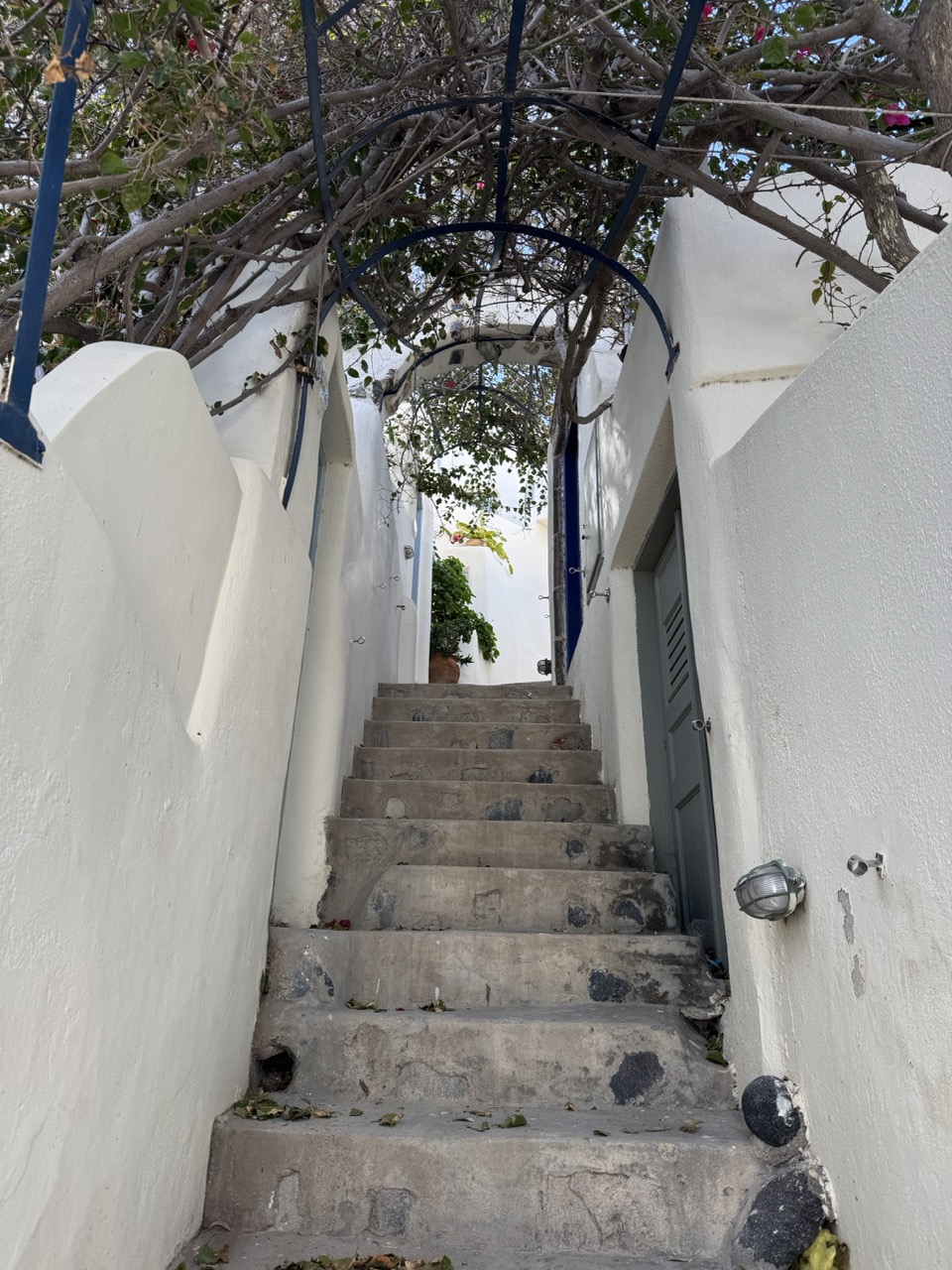 This photograph captures the timeless charm of a Mediterranean alley, where weathered stone steps and whitewashed walls evoke a sense of quiet passage through time. The arching blue metal trellis and dappled sunlight filtering through the vines lend a poetic rhythm to the composition, while the worn texture of the stairs speaks to years of footfall. Though the image is strong in atmosphere, it holds back from full visual impact due to a slightly flat color balance and a composition that, while inviting, lacks a compelling focal anchor.