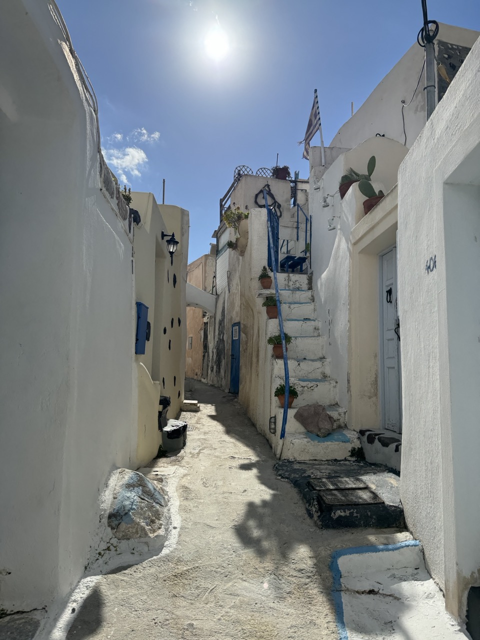 This photograph captures the sun-drenched charm of a Cycladic alleyway, where whitewashed walls and blue accents evoke a timeless Mediterranean tranquility. The strong sunlight and narrow perspective draw the eye upward, emphasizing the steep stairs and the Greek flag fluttering in the breeze. While the image effectively conveys the essence of the location, the harsh midday light flattens some of the textures and shadows, slightly diminishing the atmospheric depth.