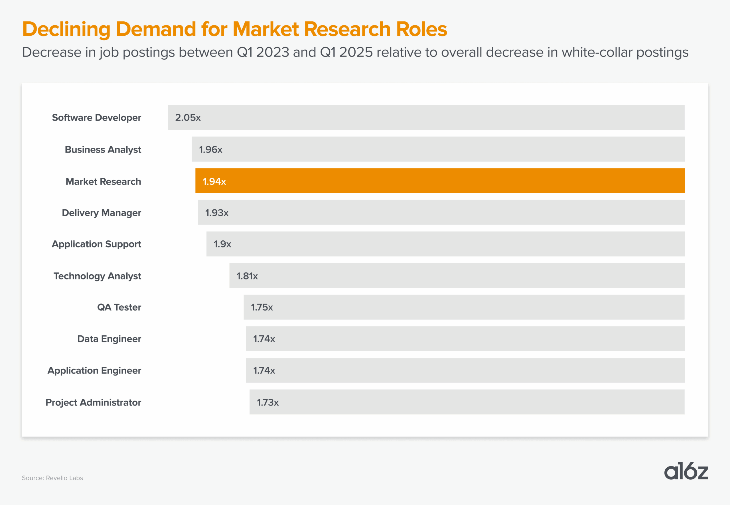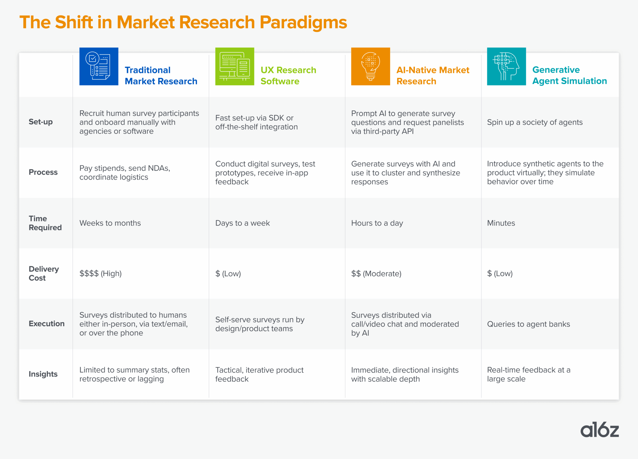 Andreessen Horowitz, AI-powered research tools are being used by many more users across a company's marketing, product, sales, and customer success teams, as well as leadership, expanding the reach of market research throughout organizations.