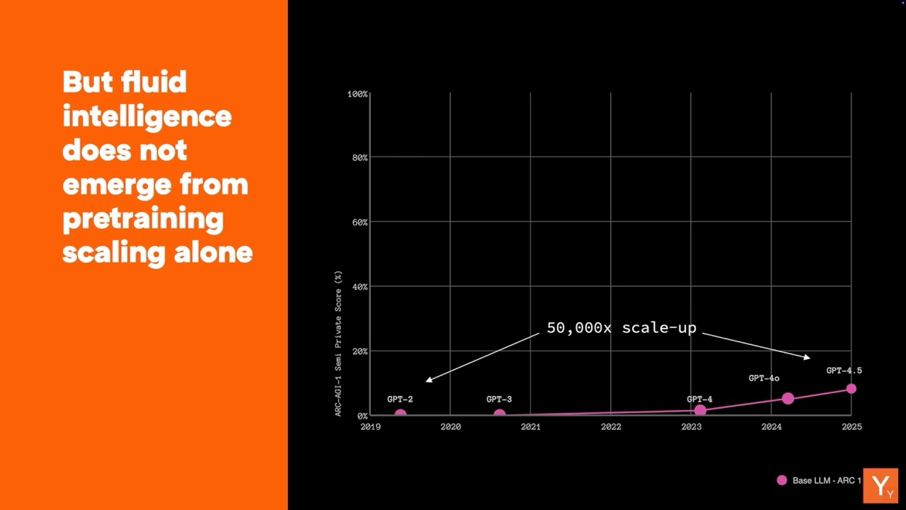 The numbers are staggering. Since 2019, AI models have scaled up by roughly 50,000 times. We've thrown unprecedented amounts of computing power and data at the problem. Yet on Chollet's Abstraction and Reasoning Corpus (ARC) benchmark, these massive models improved from 0% accuracy to just 10%. Meanwhile, any human can easily score above 95%.